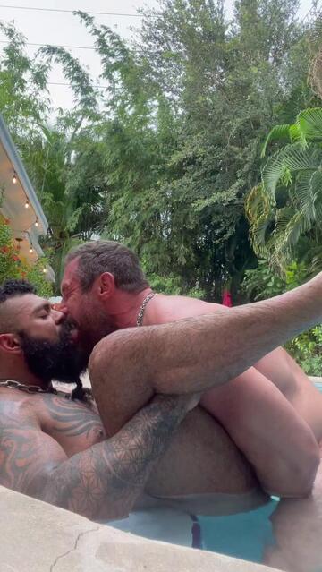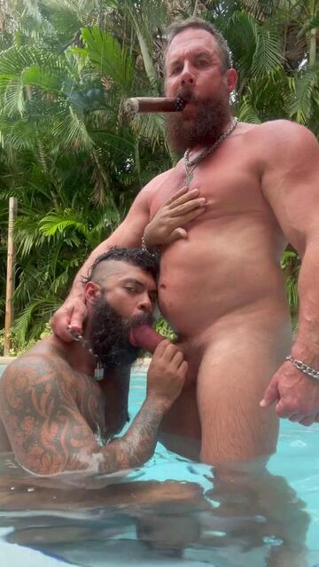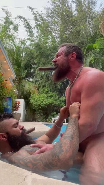 Two muscle cigar daddies in the pool smoking big cigars. Magnus services Marco’s thick cock, then tries taking it. Instead of shooting a load in his hole, Marco jerks off and cums on Magnus’s chest.